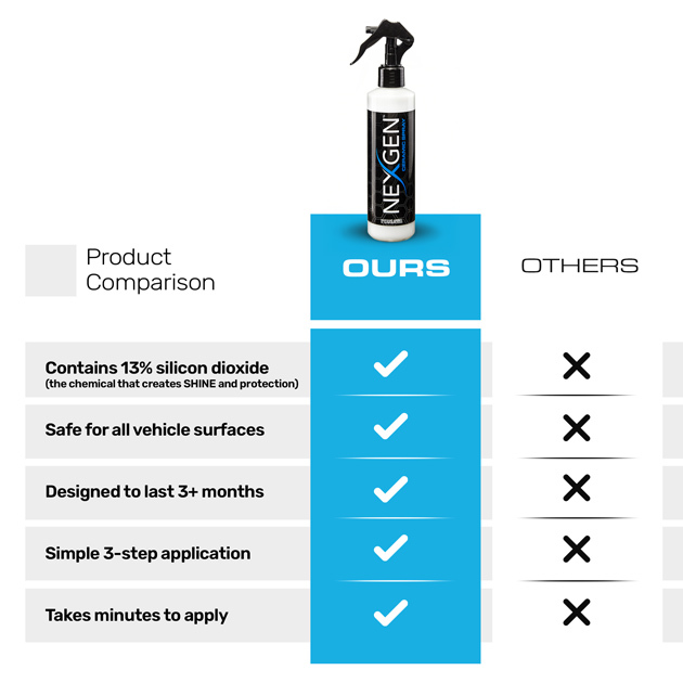 Nexgen Ceramic Spray’s proprietary surface technology deposits SiO2 onto vehicle clearcoat in 3 simple steps. A slick, glasslike coating is formed that requires 0 cure time and 0 fuss. Enjoy enhanced shine and protection from the elements for up to 6 months, depending on your local conditions.
